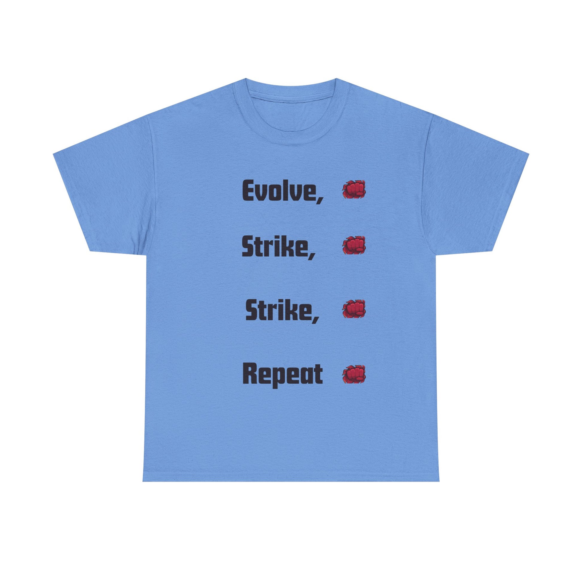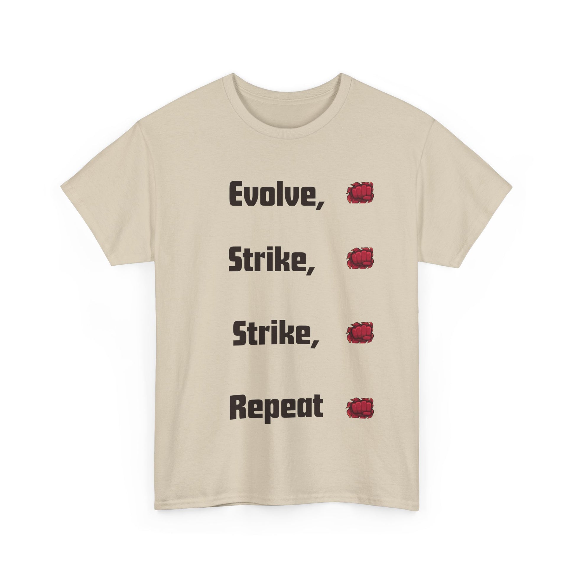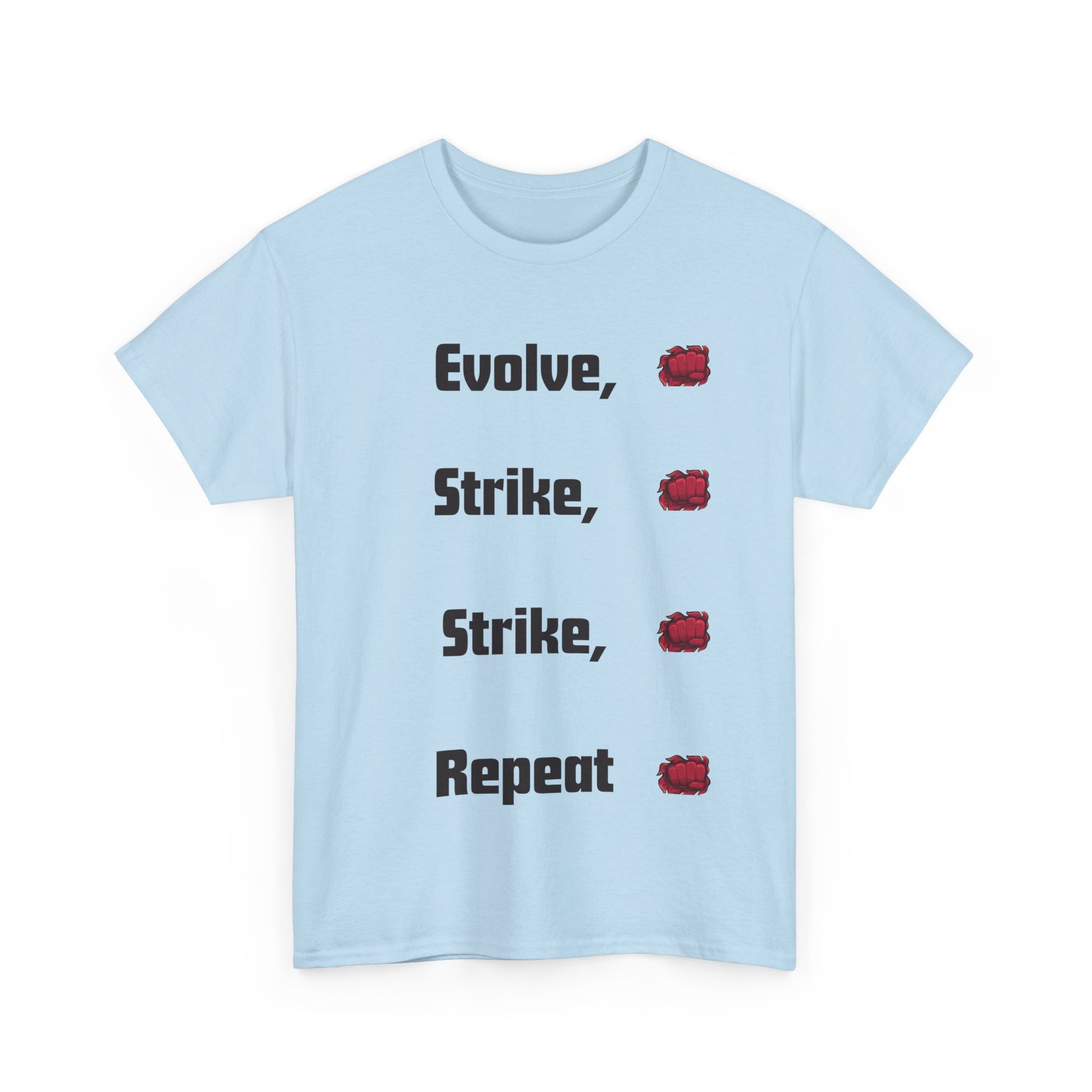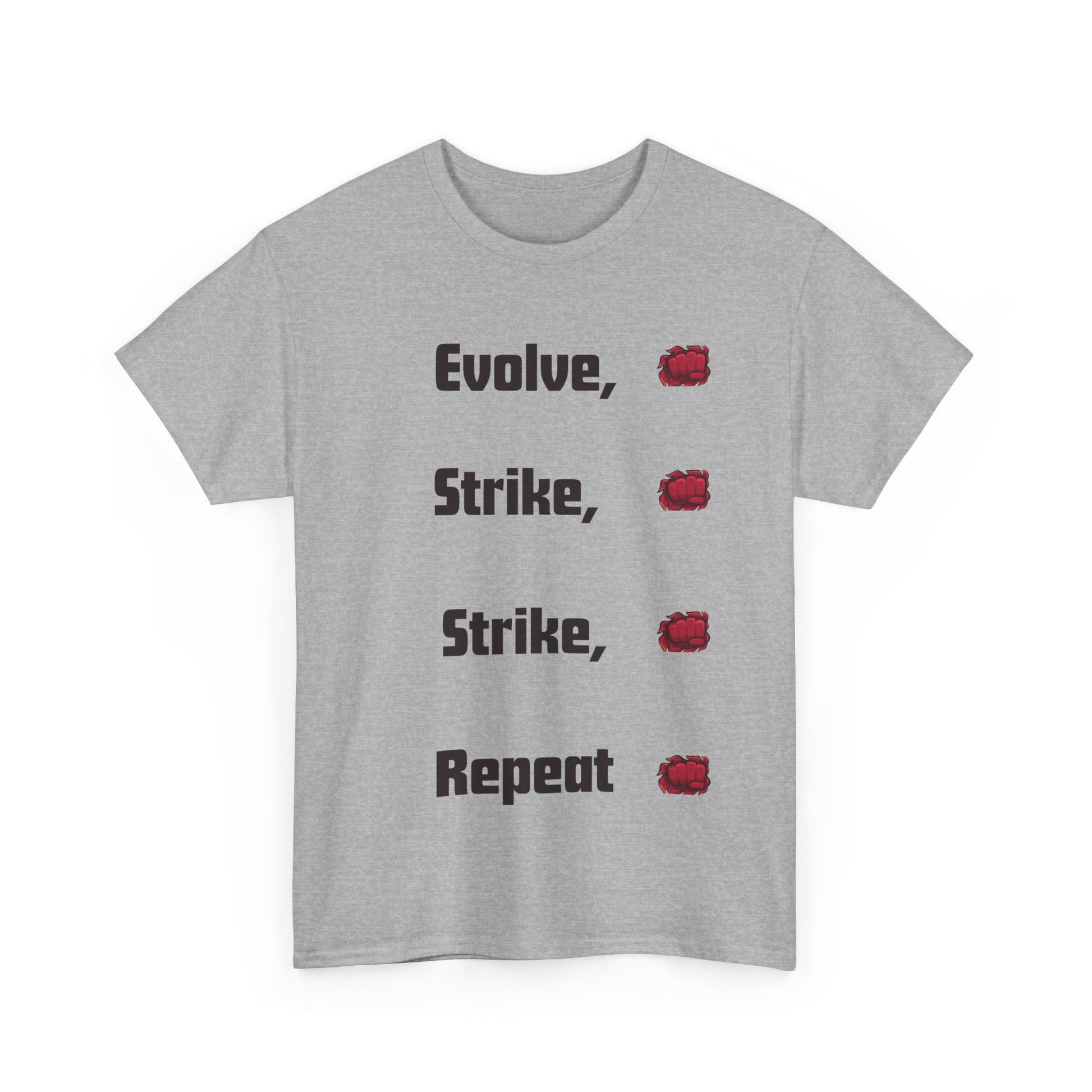 Evolve Strike Repeat Tee, a motivational graphic T-shirt perfect for gamers and casual wear during summer. This unisex shirt is designed for comfort and durability, making it a great gift idea.